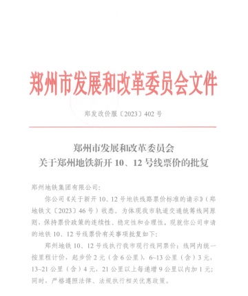 鄭州市發(fā)展和改革委員會(huì)關(guān)于鄭州地鐵新開(kāi)10、12號(hào)線(xiàn)票價(jià)的批復(fù)